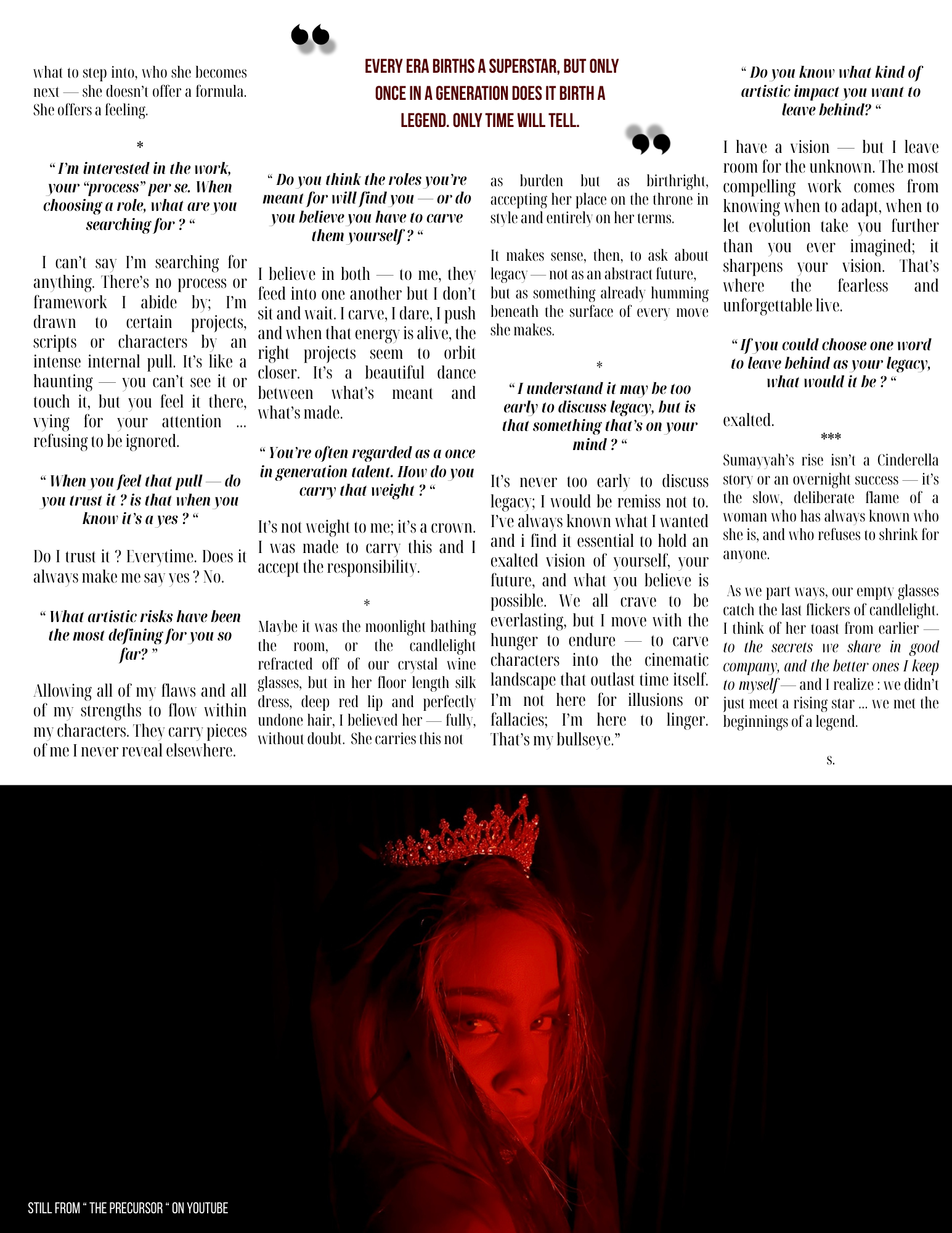 Sumayyah Ameerah is a Los Angeles based actress known for portraying emotionally complex, seductive women who draw you in with edge, intelligence and danger. Trained at the Ivanna Chubbuck Studio, she is focused on psychologically layered, auteur-driven films that explore desire, power and transformation.